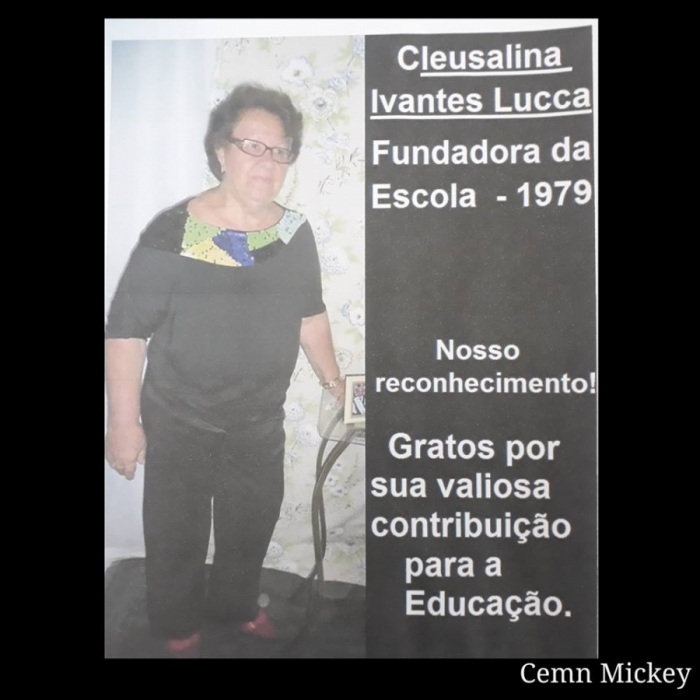 Nossa Homenagem ( in memoriam) a fundadora da escola, Senhora Cleusalina Ivantes Lucca por sua valiosa contribuição para a Educação. Por muitos anos prestou relevantes serviços na formação e na educação das crianças e adolescentes deste município.